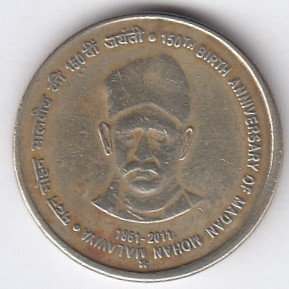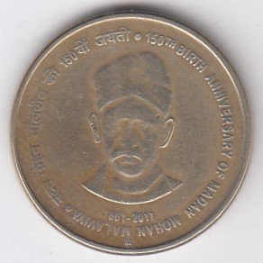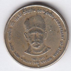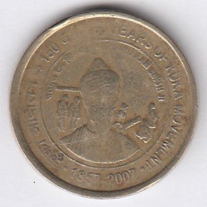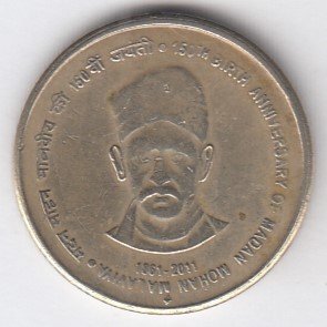 RIC107 ~ 5 RUPEES ~ 2010 ~ CHANAKYA : INCOME TAX 150 YEARS ~ COMMEMORATIVE COIN ~ NOIDA MINT