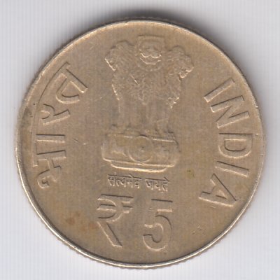 OBVERSE : “सत्यमेव जयते” BELOW LION CAPITAL OF ASHOKA PILLAR, “भारत INDIA” & “रूपये 5 RUPEES“