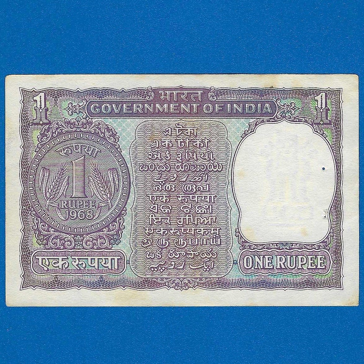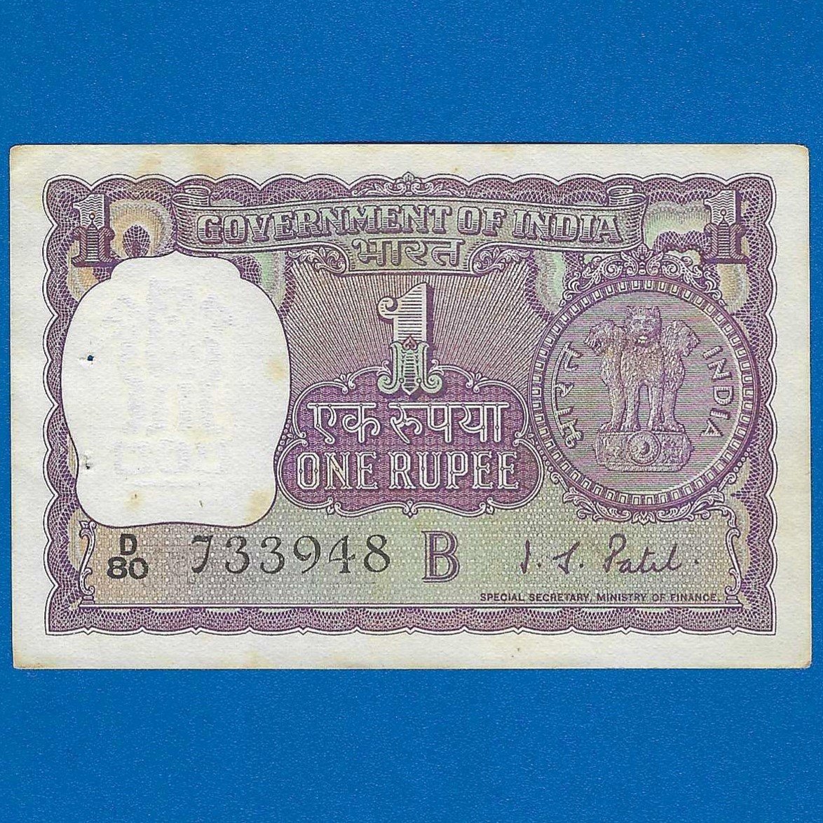 A-19 ~ 1 RUPEE NOTE ~ I G PATEL ~ BIG COIN ~ 1968 ~ INSET “B” ~ PREFIX “D” ~ RARE