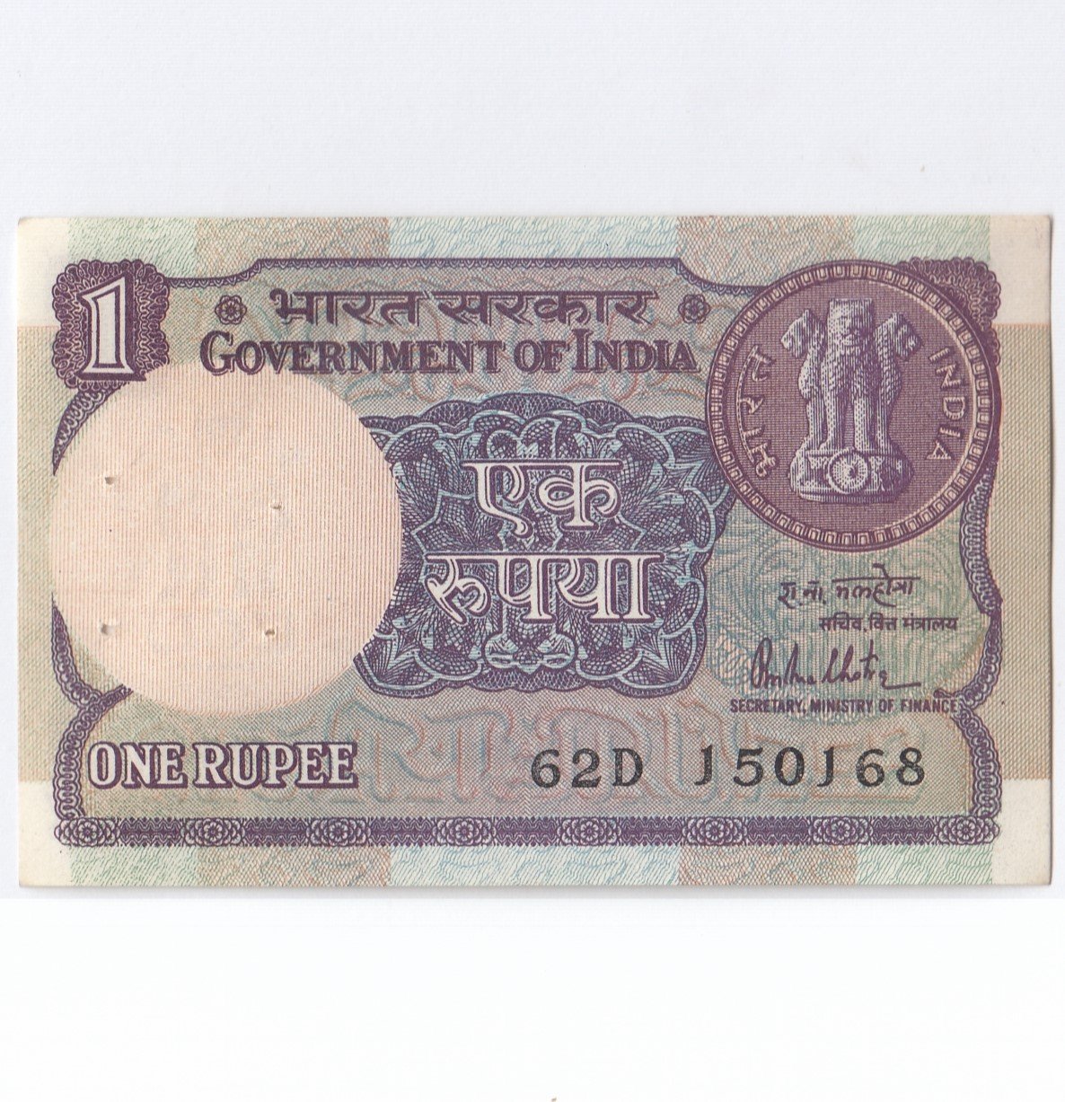 A-43 ~ 1 RUPEE NOTE ~ R N MALHOTRA ~ BIG COIN ~ 1981 ~ INSET “PLAIN” ~ PREFIX “D” ~ DATE : 15th JANUARY 68