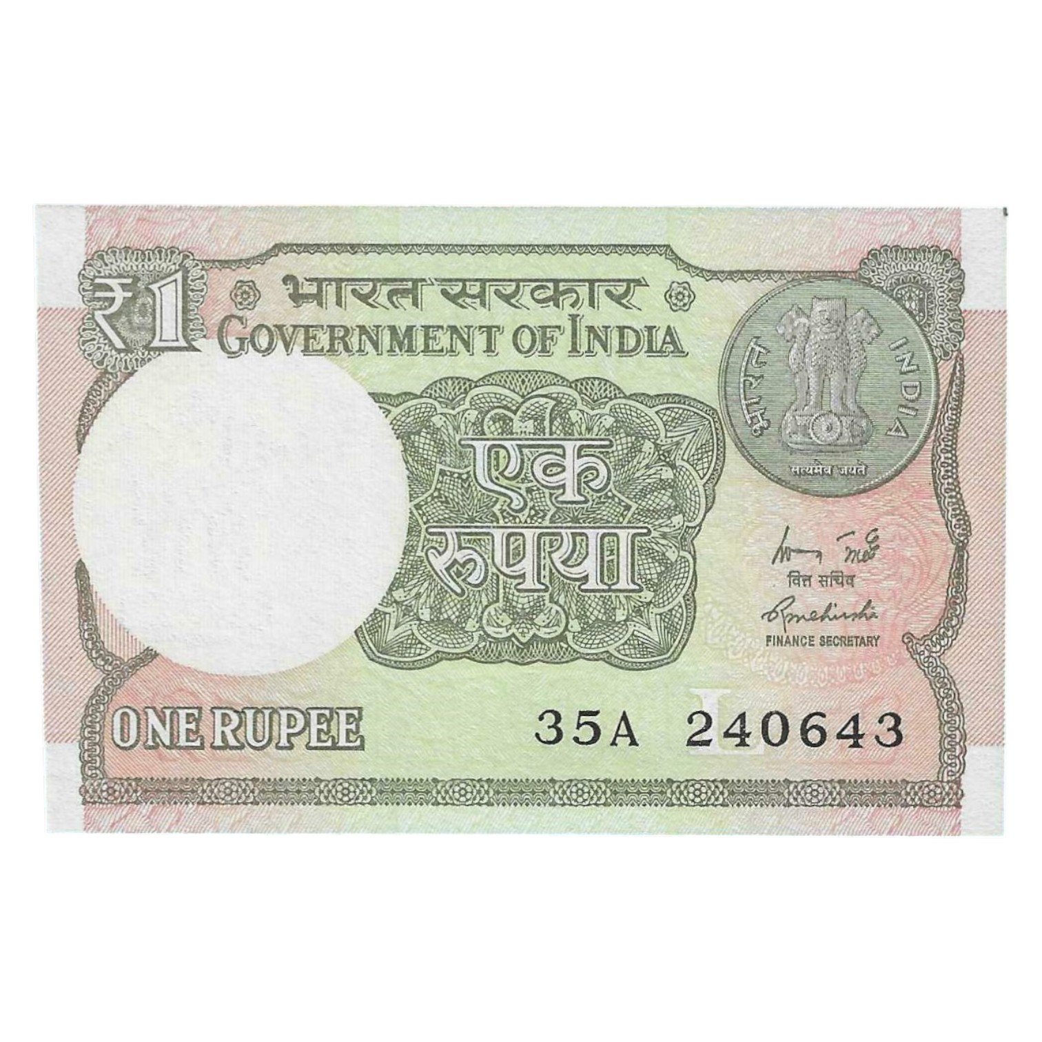 A-60 ~ 1 RUPEE NOTE ~ R MEHRISHI ~ 2015 ~ INSET “L” ~ PREFIX “A” ~ DATE : 24th JUNE 43