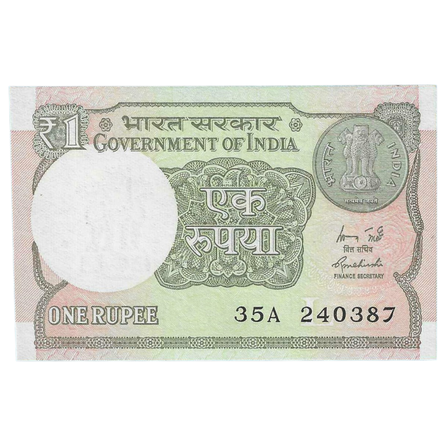 A-60 ~ 1 RUPEE NOTE ~ R MEHRISHI ~ 2015 ~ INSET “L” ~ PREFIX “A” ~ DATE : 24th MARCH 87