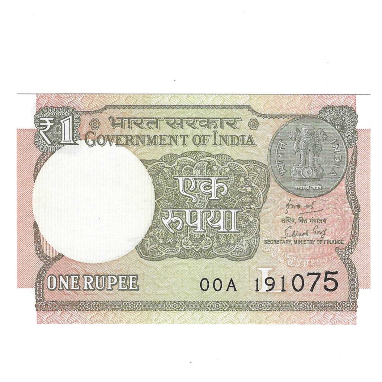 A-63 ~ 1 RUPEE NOTE ~ SUBHASH GARG ~ 2018 ~ INSET “L” ~ PREFIX “00A” ~ DATE 19th OCTOBER 75