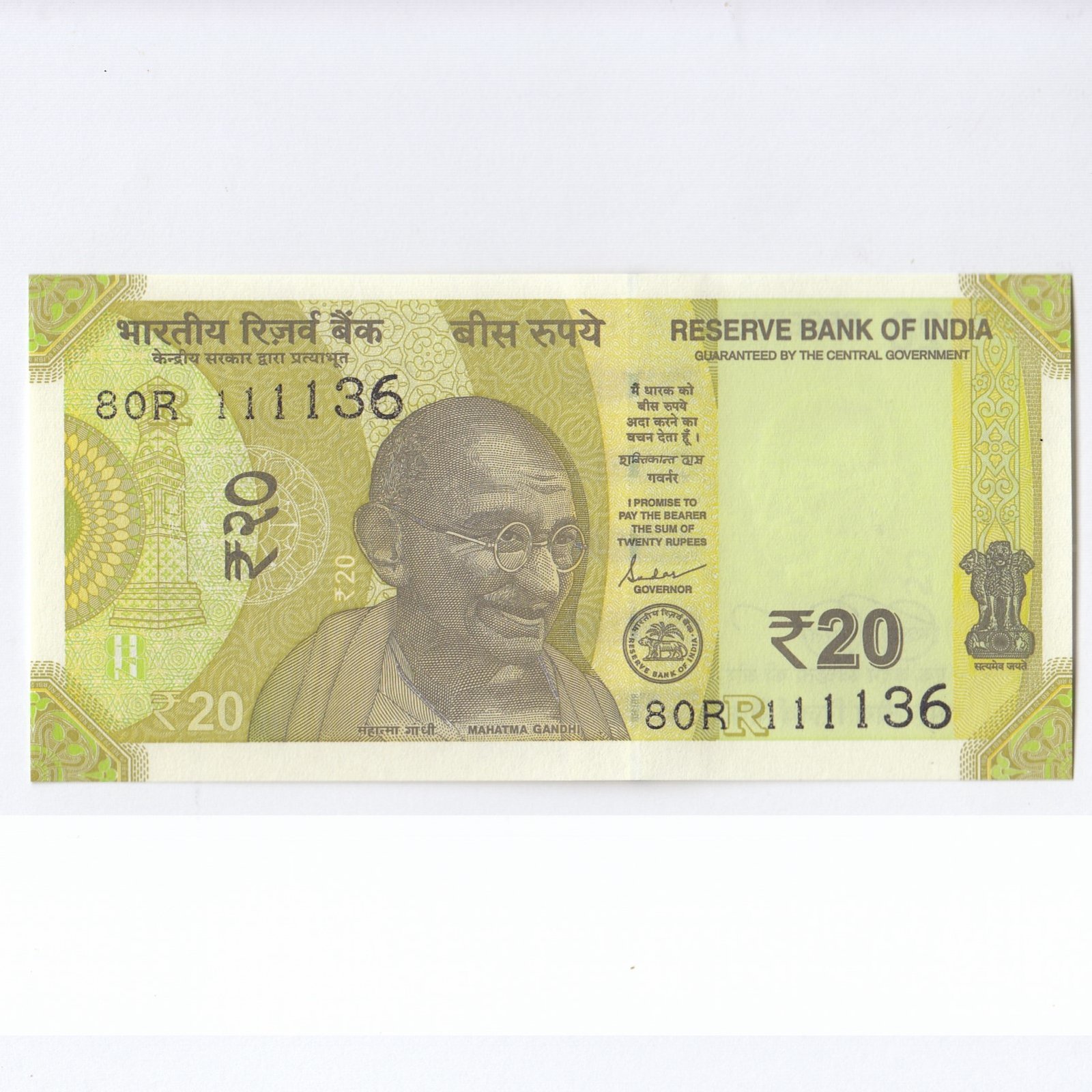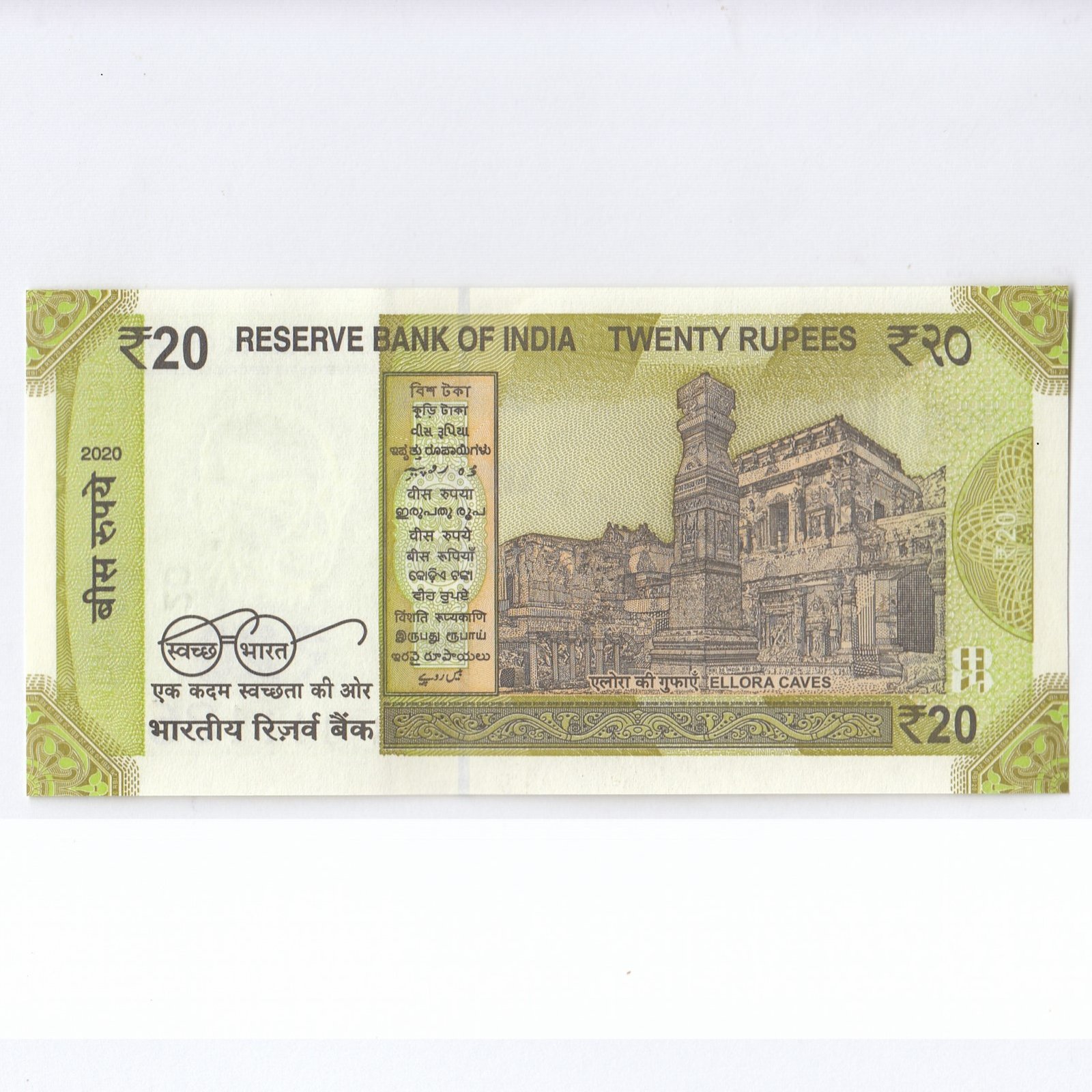 E-074 ~ 20 RUPEES NOTE ~ SHAKTIKANT DAS ~ ELLORA CAVES ~ 2020 ~ INSET “R” ~ PREFIX “R” DATE – 11th NOVEMBER 36