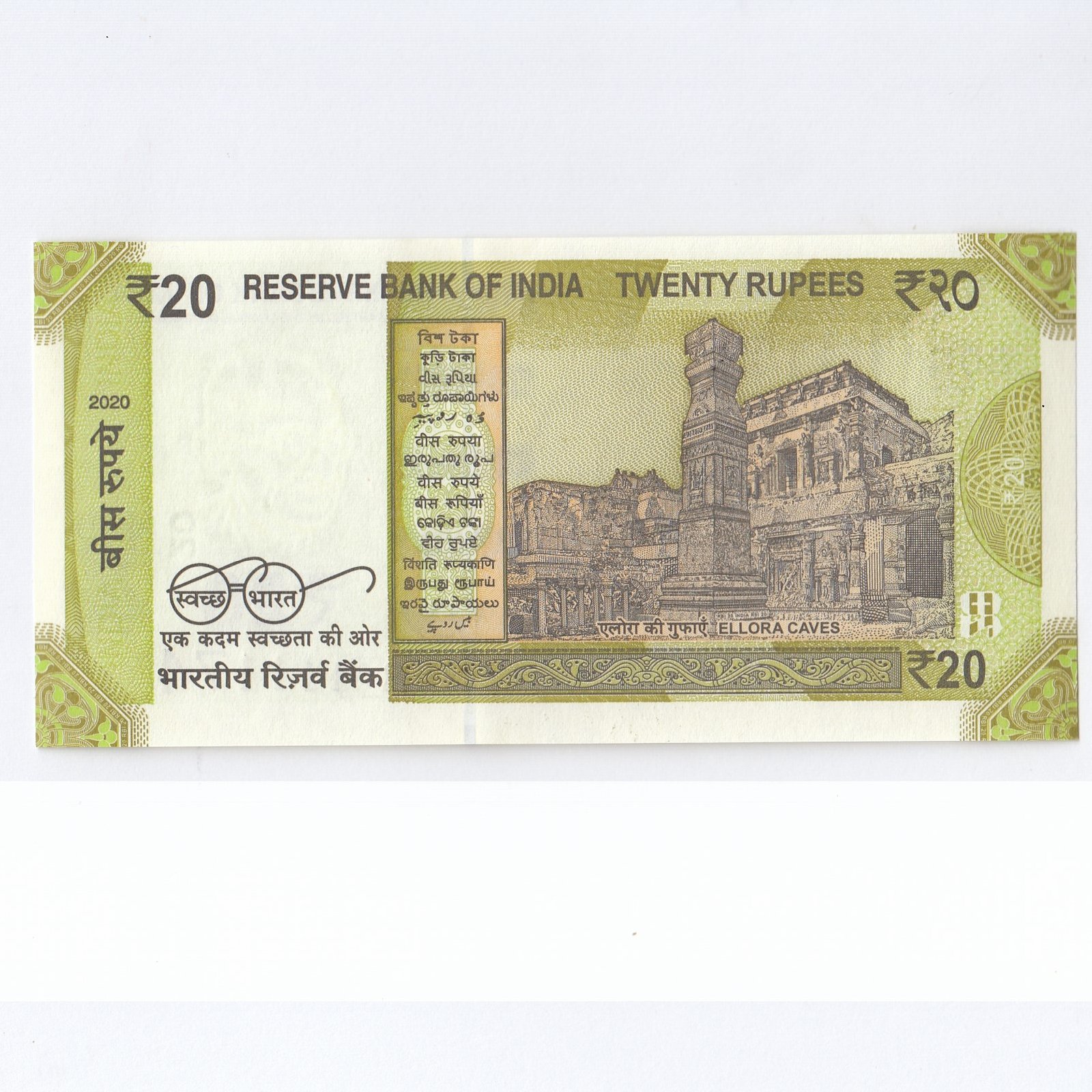 E-074 ~ 20 RUPEES NOTE ~ SHAKTIKANT DAS ~ ELLORA CAVES ~ 2020 ~ INSET “R” ~ PREFIX “R” DATE – 11th NOVEMBER 74