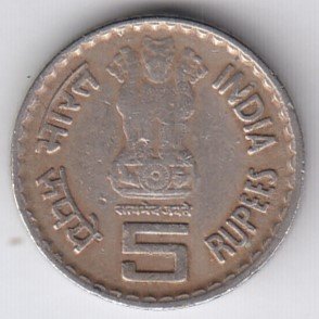 OBVERSE : “सत्यमेव जयते” & “रूपये 5 RUPEES” BELOW LION CAPITAL OF ASHOKA PILLAR, भारत INDIA