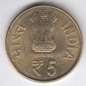 OBVERSE : “सत्यमेव जयते” & “रूपये 5 RUPEES” BELOW LION CAPITAL OF ASHOKA PILLAR, भारत INDIA