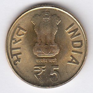 OBVERSE : “सत्यमेव जयते” & “रूपये 5 RUPEES” BELOW LION CAPITAL OF ASHOKA PILLAR, भारत INDIA